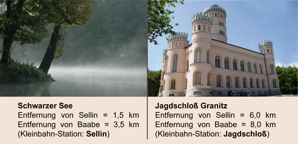 Es geht zunächst durch die mächtigen Hochwälder der Granitz, einem ausgewiesenen Landschaftsschutzgebiet. Erstes Ziel ist der idyllische und sagenumwobene Schwarze See. Eingebettet in eine etwa 3,5 Hektar große Senke, erreicht er eine geheimnisvolle Tiefe von bis zu 30 Metern. An seinen Ufern gedeihen zahlreiche unter Naturschutz stehende Pflanzen, wie sie für Hochmoore charakteristisch sind.