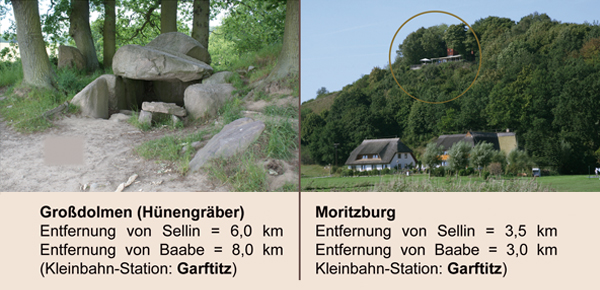 Noch weiter zurück in die Geschichte geht es dann unterhalb des Schlosses in die kleine Ortschaft Lancken Granitz. Dem Oberlehrer Furthmann ist es zu verdanken, dass in den Jahren 1971-1972 umfangreiche Ausgra- bungen unter wissenschaftlicher Leitung fünf neusteinzeitliche Großdolmen (Hünengräber) freigelegt wurden. Ihr Alter wird auf 4000 Jahre geschätzt. Von hier aus geht es an die Westseite des Selliner Sees nach Moritzdorf. Nur der Fährmann kann die Wanderer per Ruderboot „rüberholen“ auf die Moritzburg. Das kulinarische Verwöhnprogramm sollte man sich nicht entgehen lassen! Dabei schweift der Blick über die zwischen Moritzdorf und Baabe verlaufende nur 50 Meter breite Strömungsrinne zwischen dem Selliner See und der Having, bis über Teile von Mönchgut.