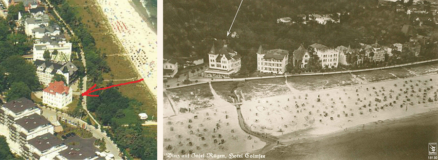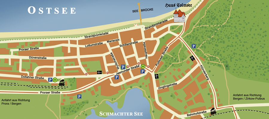 Damit Sie sich eine bessere Vorstellung zur Lage unseres Hauses machen können, haben wir Ihnen einen kleinen Plan erstellt. "Haus Colmsee" befindet sich am Binzer Südstrand. Einst brachte die Strandnutzung hier dem Fürsten Wilhelm Malte zu Putbus jährlich zwischen 6.000 und 7.000 Goldmark. Grund genug die weitere Entwicklung zu befördern! Nachdem der Fürst dafür gesorgt hatte, dass eine Strand-Allee (die heutige "Putbuser Straße") den Strand erschloß, setzte auch der Bau weiterer Pensionen und Hotels ein.