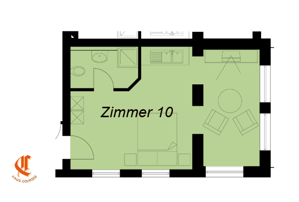 Ausgestattet ist das Zimmer mit Möbeln im Landhausstil, mit Kabel-TV und einer Frühstücksküche (die über Kühlschrank, Spüle, Kaffeemaschine, Wasserkocher, Eierkocher, Toaster, Geschirr, Besteck, Gläser und ein Geschirrtuch verfügt). Zur Grundausstattung zählen auch Bettwäsche, Hand- und Badetücher sowie Fön.