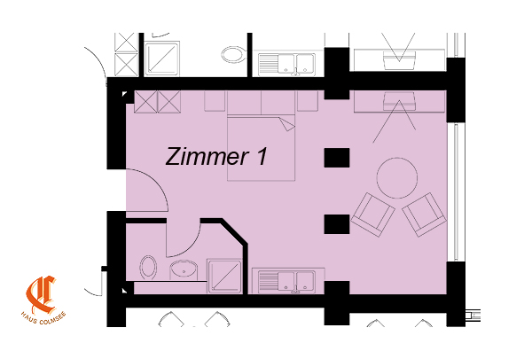 Ausgestattet ist das Zimmer mit Möbeln im Landhausstil, mit Kabel-TV und einer Frühstücksküche (die über Kühlschrank, Spüle, Kaffeemaschine, Wasserkocher, Eierkocher, Toaster, Geschirr, Besteck, Gläser und ein Geschirrtuch verfügt). Zur Grundausstattung zählen auch Bettwäsche, Hand- und Badetücher sowie Fön.